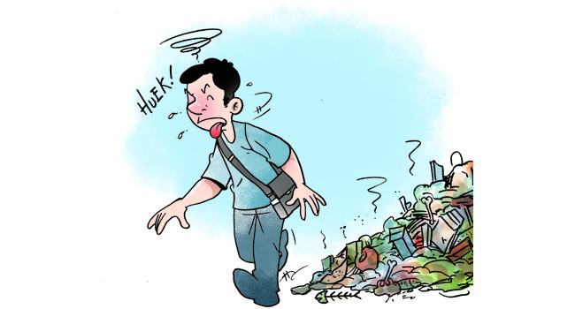 Tumpukkan sampah yang didominasi sisa makanan tersebut hampir menutupi badan jalan. Belum lagi aroma menyengat yang tercium ketika melintasi jalan itu. Bahkan, baunya mulai masuk ke rumah warga sekitar.