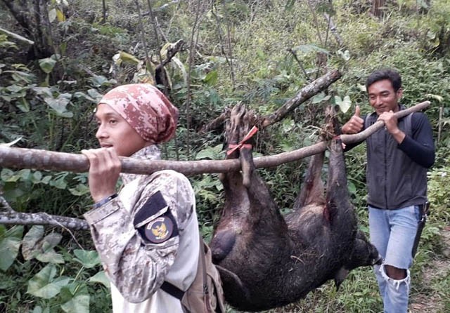 BERBURU:Pemburu babi hutan berhasil mendapatkan buruanya beberapa waktu lalu. Banyaknya serangan babi hutan dan juga monyet membuat warga Wanayasa resah. (Darno/Radar Banyumas/JPG)