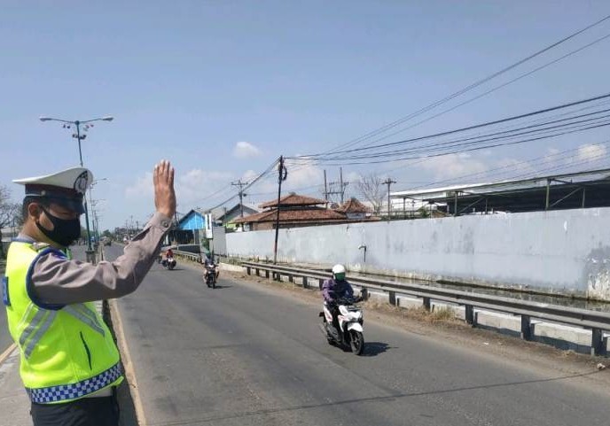 Petugas Satlantas Polres Demak berjaga-jaga di jalan raya Pantura Sayung perbatasan Demak-Semarang. Jelang Lebaran, kondisinya lancar. Wahib Pribadi/RadarSemarang