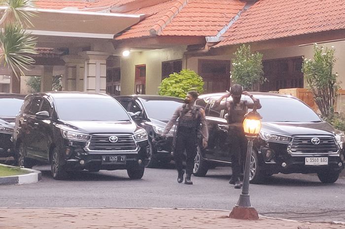 Saat keluar, petugas tampak membawa dua koper berwarna biru dan hitam serta satu kardus. Rombongan lalu meluncur ke pendopo.