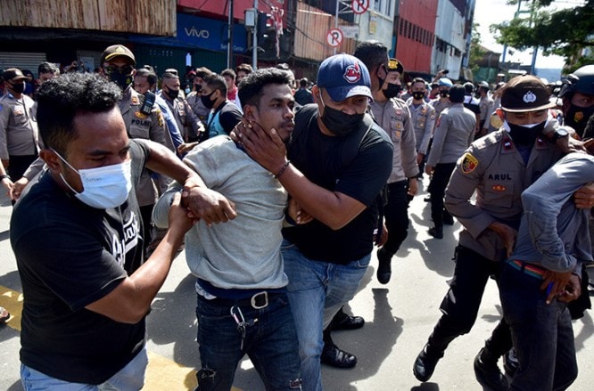 Aparat Polresta Pulau Ambon dan Pulau-Pulau Lease didukung TNI dan Satgas Penanganan Covid-19 Kota Ambon, membubarkan paksa aksi ratusan mahasiswa dari sejumlah perguruan tinggi pada Jumat (16/7) siang. Massa menggelar demo hingga dua tahap, dimulai pada Jumat pagi di depan kantor Wali Kota Ambon dan pada siang hari massa makin banyak setelah salat Jumat.
