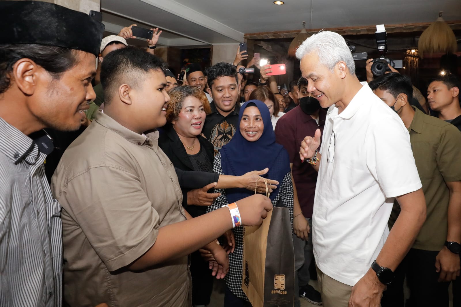 Tak hanya bertemu saja, Radit juga memberikan cenderamata berupa outer kepada Ganjar Pranowo. Bahkan, barang yang diberikan oleh Radit langsung dikenakan oleh Capres berambut putih ini.
