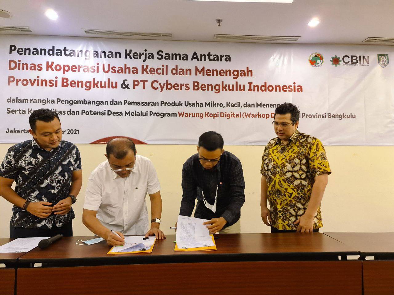 JawaPos.com - Warkop Digital terus mengembangkan kerja sama dengan Pemerintah Provinsi Bengkulu untuk mewujudkan pengembangan Warung Kopi Digital di desa-desa yang ada di Bengkulu. Dalam rangka Pengembangan dan Pemasaran Produk Usaha Mikro, Kecil, dan Menengah, serta Komiditas dan Potensi Desa, Dinas Koperasi UKM (Usaha Kecil dan Menengah) Provinsi Bengkulu menandatangani perjanjian kerja sama dengan PT Cybers Bengkulu Indonesia. Perjanjian yang ditandatangani di Jakarta pada 29 Oktober 2021, akan mendorong akselerasi digitalisasi UMKM dan pengembangan Warkop Digital di 1.341 desa.
