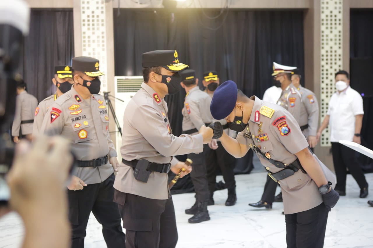 JawaPos.com - Kapolda Jawa Timur Irjen Pol Nico Afinta memimpin Upacara serah terima jabatan (Sertijab) empat pejabat utama dan lima Kapolres. Acara digelar di Gedung Mahameru Mapolda Jatim, Jumat (7/1).