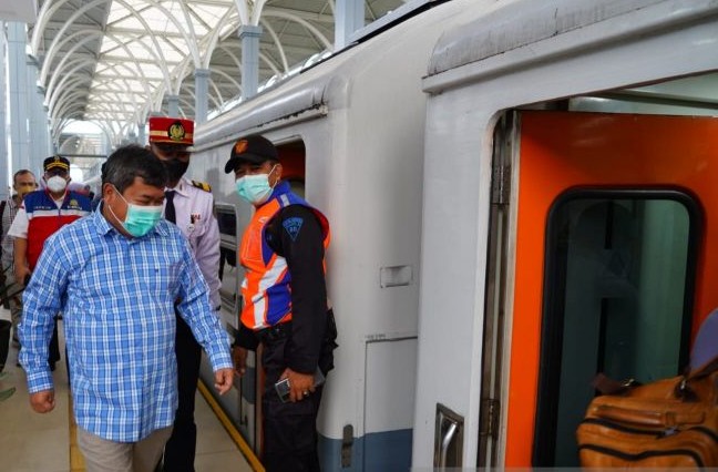 Bupati Garut Rudy Gunawan menumpang kereta api uji coba tujuan Stasiun Pasar Senen, Jakarta, Minggu (20/2). Diskominfo Garut/Antara - Image
