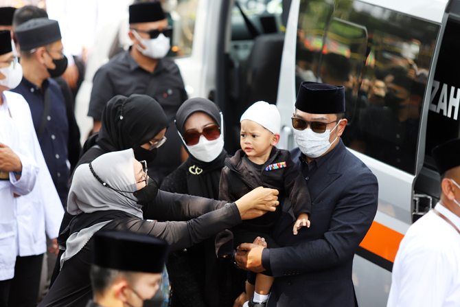 Gubernur Ridwan Kamil, istri Atalia Praratya Kamil dan putra bungsunya Arkana tampak bersama saat Peti jenazah almarhum Emmeril Kahn Mumtadz dibawa menuju pemakaman. Foto: Dery Ridwansah/ JawaPos.com