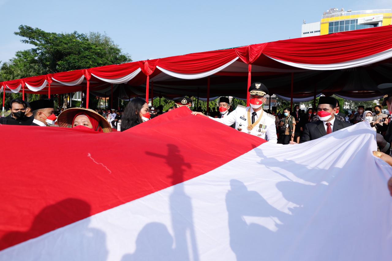 Gubernur Jawa Tengah (Jateng) Ganjar Pranowo membentangkan bendera merah putih.