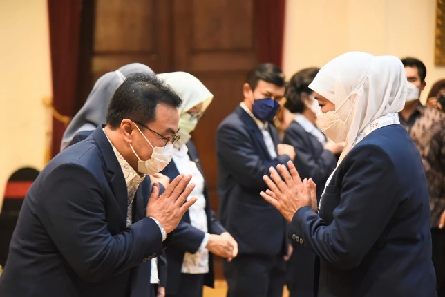 Ketua YKI Jawa Timur Joni Wahyuhadi (kiri) menemui Gubernur Jatim Khofifah Indar Parawansa. Pemprov Jatim for JawaPos