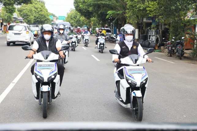 Gubernur Jatim Khofifah Indar Parawansa menggunakan motor listrik. Pemprov Jatim for JawaPos