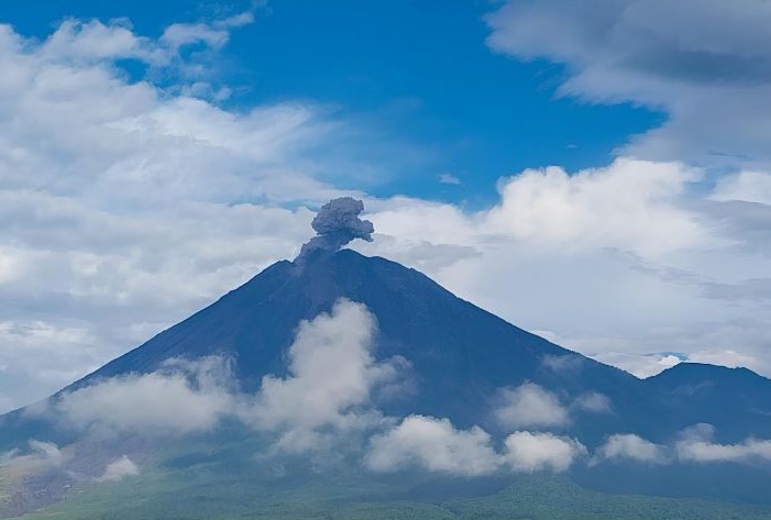 Kolom abu vulkanik membumbung dari puncak Gunung Semeru yang terpantau dari pos pengamatan di Gunung Sawur, Kabupaten Lumajang, Selasa (6/2).