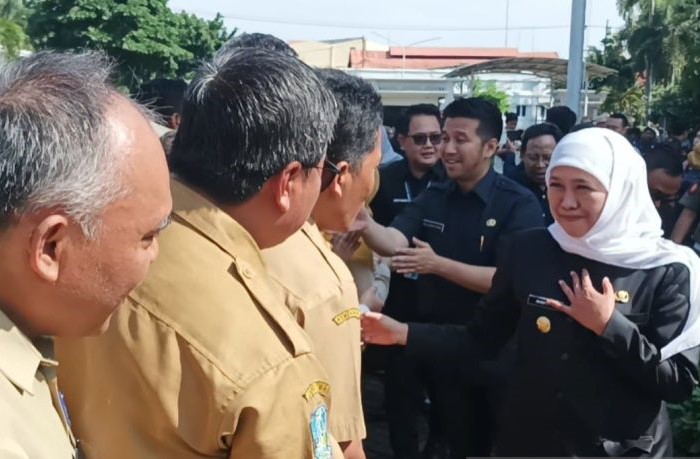 Gubernur Jatim Khofifah Indar Parawansa dan Wagub Emil Elestianto Dardak berpamitan kepada ASN usai apel terakhir yang dipimpinnya, Senin (12/2).