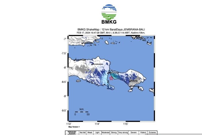 JawaPos.com–Badan Meteorologi Klimatologi dan Geofisika (BMKG) melaporkan, gempa tektonik mengguncang wilayah Jembrana, Bali; hingga Banyuwangi, Jawa Timur; dan sekitarnya. Gempa bermagnitudo 4,1 terjadi pada Minggu (18/2) pagi.