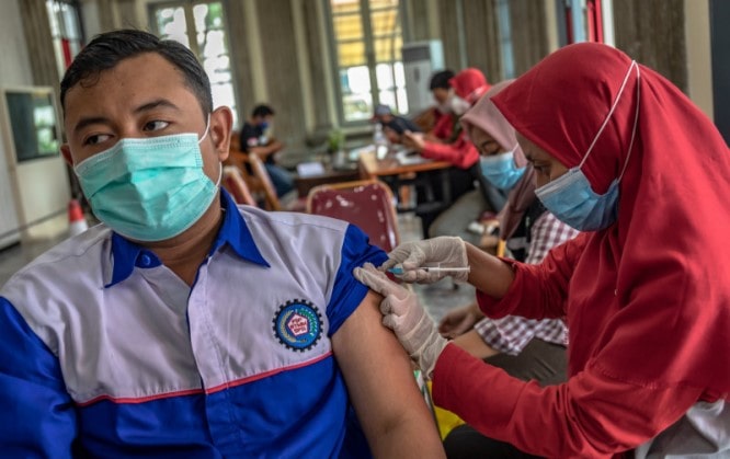 Vaksinator menyuntikkan vaksin Covid-19. Aji Styawan/Antara
