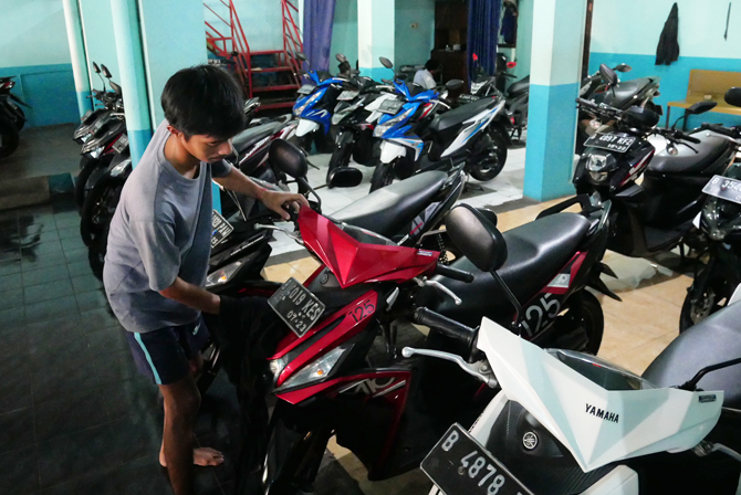 Karyawan showroom motor bekas saat mengecek sepeda motor, Jakarta, Kamis (14/4/2022). Pemerintah menarik Pajak Pertambahan Nilai (PPN) atas transaksi jual-beli kendaraan bermotor bekas. Pajak dikenakan adalah 1,1 persen dari harga jual kendaraan bekas. Ke