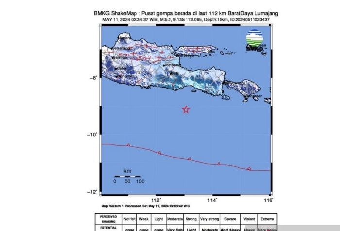 JawaPos.com–Badan Meteorologi Klimatologi dan Geofisika (BMKG) melaporkan, telah terjadi gempa dengan magnitudo 5,2 di Kabupaten Lumajang, Jawa Timur (Jatim). Gempa terjadi pada Sabtu (11/5) sekitar pukul 02.34 WIB.