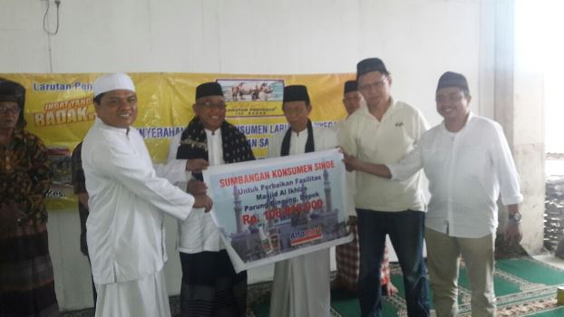 Perwakilan PT Sinde Budi Sentosa dan Alfamart menyerahkan bantuan ke DKM Al Ikhlas di Jalan Raya Parung Bingung,