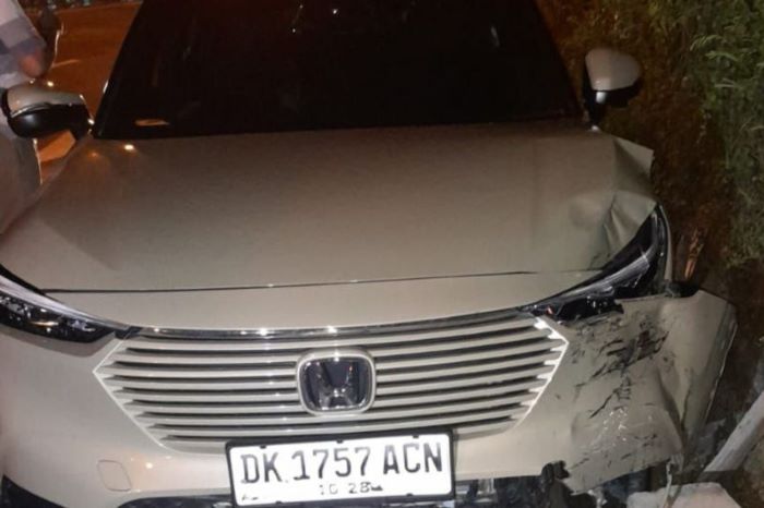 Penampakan mobil yang dikendarai WNA asal Inggris, Thomas James Simpson, usai menabrak warga di Sanur, Denpasar, Bali. (Humas Polresta Denpasar/Antara)