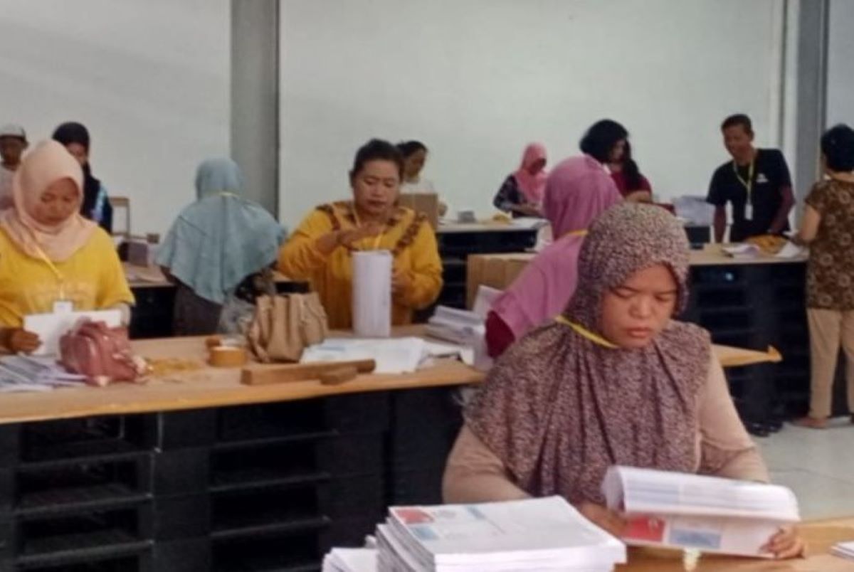 Pekerja melakukan sortir dan lipat surat suara untuk pelaksanaan pilkada di Kabupaten Pamekasan. (KPU Pamekasan/Antara)