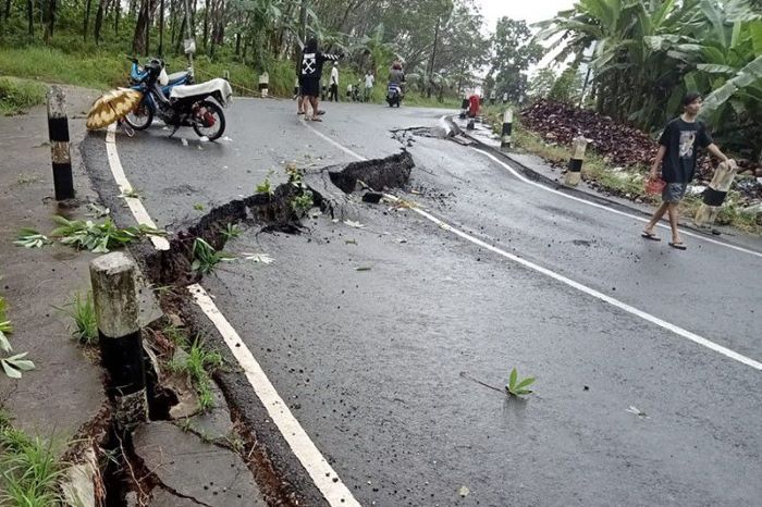 ”Sehingga jalannya ambles. Tergerus dan longsor (ambles) dari selatan dan di bawah aspal tergerus ke utara jadi turun, kemudian yang patah adalah batas badan,” ucap Gatot Arief Widodo.