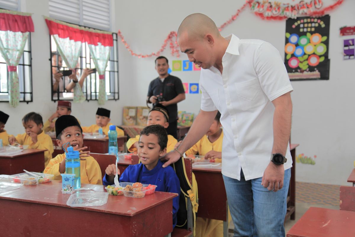 George yang juga pemilik Kawasan Khusus Ekonomi (KEK) Galang Batang ikut menikmati menu makanan MBG yang dibagikan kepada para siswa.