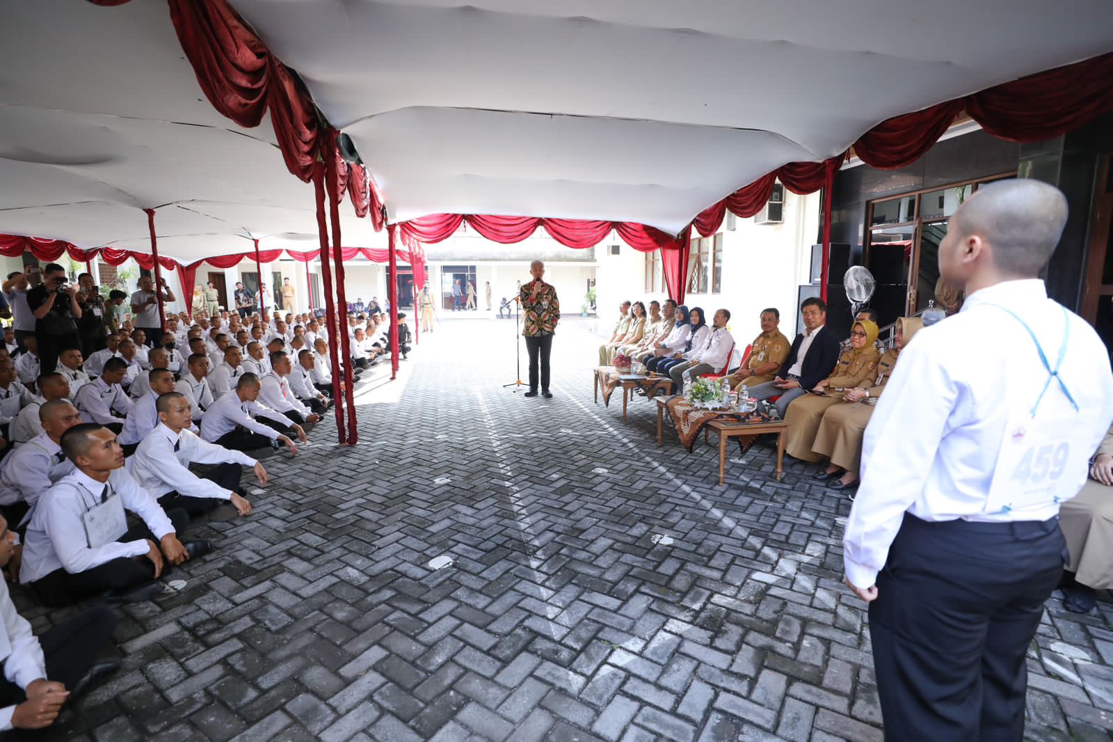 Gubernur Jawa Tengah Ganjar Pranowo memberikan arahan pada Pembukaan Seleksi Magang Jepang Tahun 2023 di Halaman Kantor Disnakertrans Provinsi Jateng, Kota Semarang, Jateng, Senin (12/6).