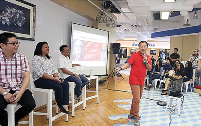 Marketing Director MPM Dendy Sean berbicara saat talk show di lounge Jawa Pos, Graha Pena Surabaya, akhir pekan lalu.