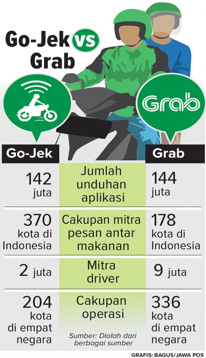 ''Grab bisa berfokus untuk memperluas driver dan konsumen. Sedangkan fokus Go-Jek sudah bukan di layanan transportasinya. Go-Jek bisa ambil keuntungan dari Go-Food dan Go-Pay jika cermat. Dan, keuntungannya bisa mengembangkan layanan transportasinya,'' tuturnya.