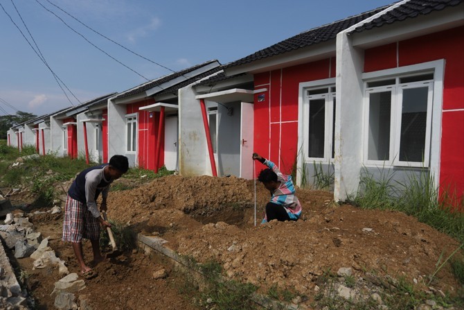 Pekerja saat menyelesaikan salah satu rumah subsidi di kawasan Parung Panjang, Jakarta, Jumat (26/6/2020). Survei Bank Indonesia mencatat penjualan rumah di pasar primer selama 3 bulan pertama tahun ini anjlok 30,52 persen atau lebih dalam dari kuartal se