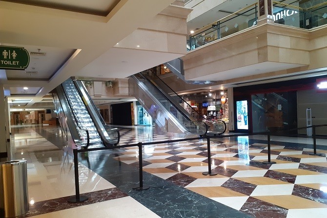 Suasana sepi Puri Indah Mall (PIM), Jakarta, Rabu (27/5). Hanya gerai makanan dan kesehatan dan beroperasi saat PSBB. (Saifan Zaking/JawaPos.com)