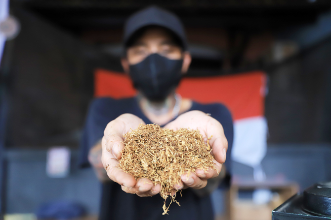 Penjual tembakau linting Kamarasa saat merapihkan tembakau di kawasan Pondok Cabe Pamulang, Selasa (4/1/2022). Rokok linting kini semakin diminati masyarakat seiring kenaikan harga jual rokok terdapat dalam Peraturan Menteri Keuangan Nomor 192/PMK.010/20