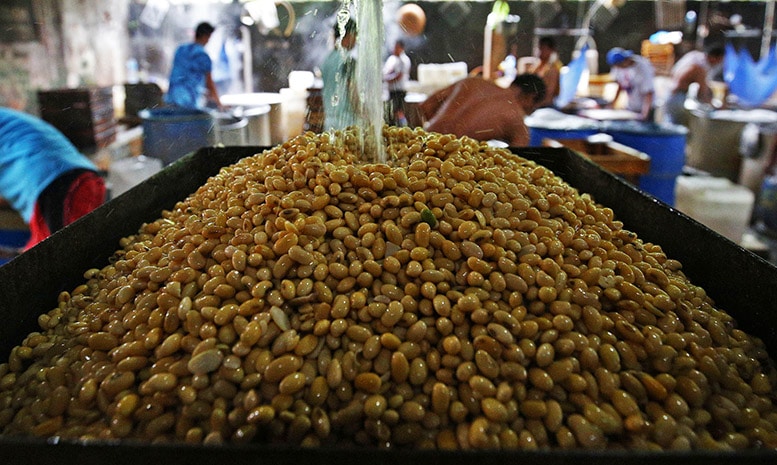 Pekerja memproduksi tahu di pabrik, Jakarta, Selasa (5/1/2020). Harga kedelai di pasaran naik dari harga Rp 7.000 per kilogram menjadi Rp.9.000 per kilogram.FOTO:MIFTAHULHAYAT/JAWA POS