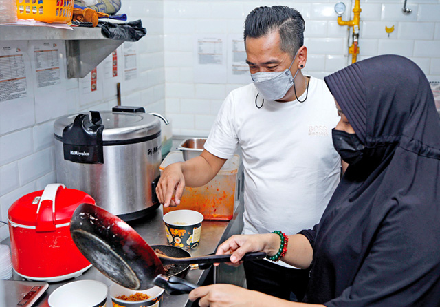 TAMPUNG 10 TENANT: Thomas Tirta melihat pegawai salah satu tenant yang membuat pesanan konsumen di dapur bersama di Embong Gayam, Surabaya, Jumat (26/8), (Puguh Sujiatmiko/Jawa Pos)
