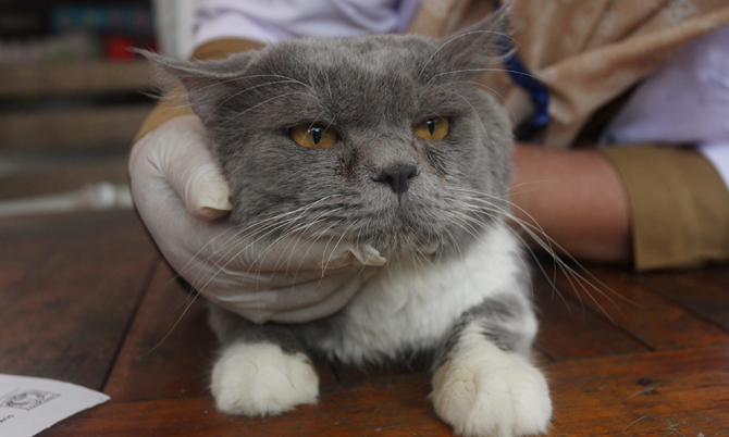 Vaksin rabies kepada sejumlah hewan peliharaan milik warga di Kantor Kecamatan Duren Sawit, Jakarta Timur, Selasa (7/6/2022). Vaksinasi rabies digelar secara gratis untuk warga Jakarta yang memiliki hewan peliharaan seperti kucing, anjing, musang, monyet