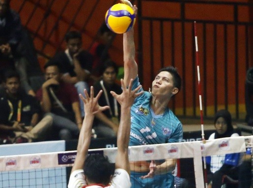 Tim Putra Lamongan Sadang MHS Dimas Saputra melakukan melakukan spike ke daerah pertahanan Jakarta Garuda di pertandingan bola voli pro liga putaran pertama seri kedua di Purwokerto, Jawa Tengah, Sabtu (1/2/2020). Lamongan Sadang MHS berhasil mengalahkan