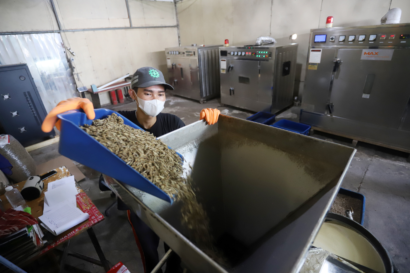 ILUSTRASI. Pekerja mengeringkan maggot untuk di jadikan makanan ternak di produksi Magalarva, Gunung Sindur, Bogor, Jawa Bara Rabu (10/7). (DERY RIDWANSAH/JAWAPOS.COM)
