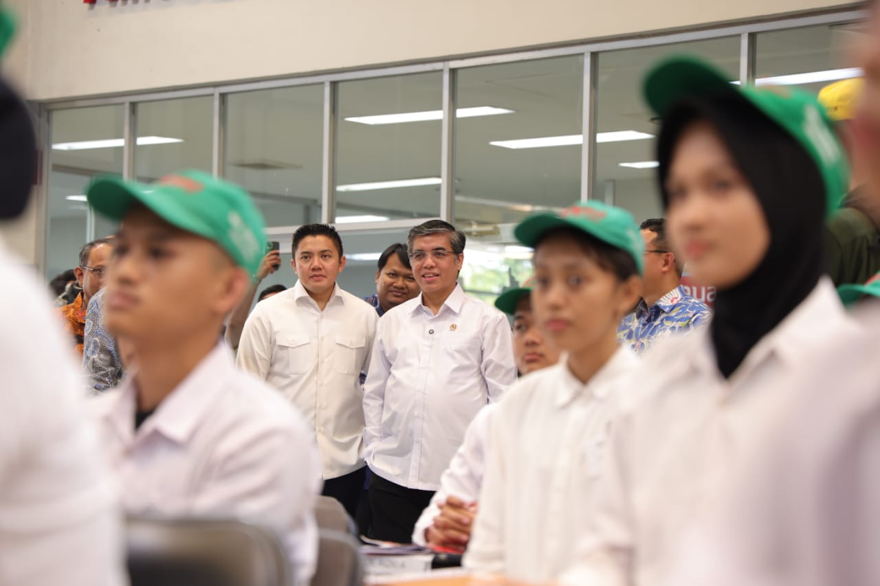 Menteri Ketenagakerjaan, Yassierli, bersama Sekretaris Kabinet Teddy Indra Wijaya, meninjau pelaksanaan Program Pemagangan Nasional Batch I di PT Denso Indonesia. (Istimewa)