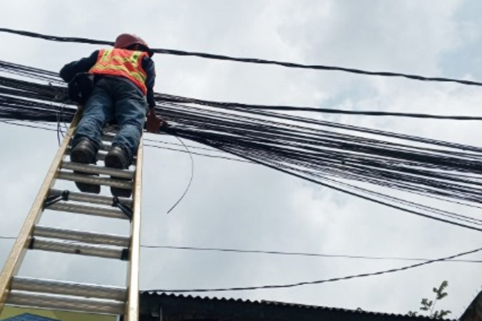 Kegiatan merapikan jaringan fiber optic milik PLN Icon Plus seperti yang dilakukan PLN Icon Plus Regional SBU Jawa Barat di Jalan Raya Padalarang, Bandung Barat.