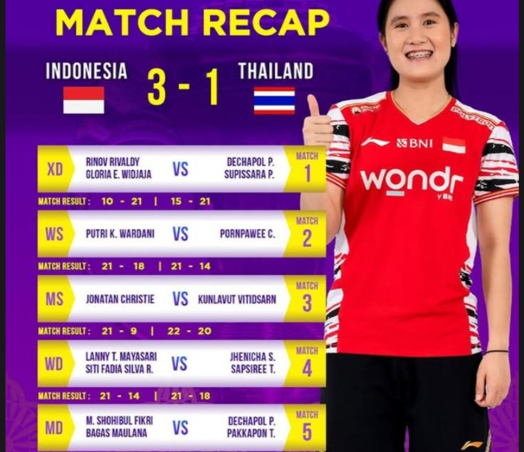 Berikut adalah rekap hasil Indonesia vs Thailand di perempat final Piala Sudirman 2025