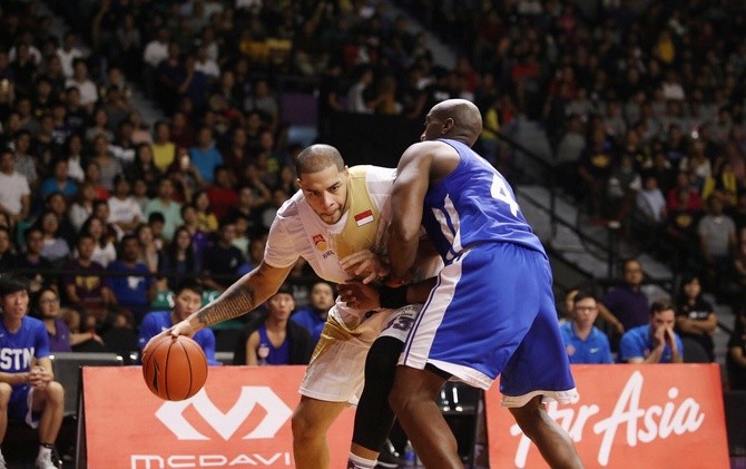 Pemain Andalan CLS Knights Indonesia Brian Williams dihadang oleh penggawa Hong Kong Eastern Ryan Moss.