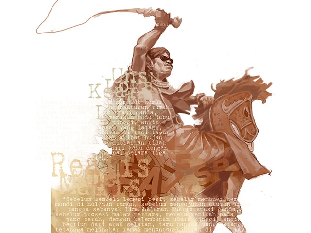 ”Sebagai dosen dan penyair, Dimas memiliki dorongan kuat untuk meneliti manusia, bahkan di saat harusnya ia duduk manis wangi dan wajahnya penuh bedak, menerima jabat tangan di pelaminan. Empat kuda lumping yang sudah kesurupan dengan iringan gamelan dan taburan bunga mawar gaib ia ambil alih. Ia meminta iringan musik gamelan dihentikan. Orang-orang merasa itu tidak wajar, tapi karena yang punya hajat yang membayar, mau bagaimana lagi. Ia lalu terbukti secara sah dan meyakinkan di muka umum telah melakukan percobaan yang belum pernah dilakukan oleh orang lain sebelumnya. Ia pertama-tama mengganti iringan musik gamelan dengan rekaman musik rock. Hasilnya, empat pemain kesurupan itu masih menari atraktif, namun gerakannya memang lebih kacau dan agak serampangan; mengibas-ngibaskan kepala sehingga mahkota kesatria berkuda di kepala mereka jatuh ke tanah pasir basah. Barangkali musik ini belum akrab di dunia gaib. Kedua, ia menggantinya dengan slow-rock, dan mereka nyata menari lebih pelan memang. Saat ia menggantinya dengan musik dangdut, tariannya berubah menjadi syahdu dan didominasi goyang pinggul, langkah-langkah kecil, dan jari-jemari mekar kuncup-mekar kuncup nikmat sekali. Keajaiban terjadi saat musik yang dimainkan, dari rekaman disalurkan ke pengeras suara, berganti dengan musik jazz, rebana, reggae, dan instrumental piano Chopin.”