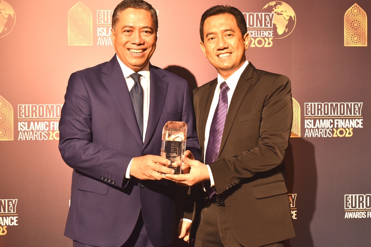 Direktur Consumer Banking BTN Hirwandi Gafar (kiri) menerima penghargaan Best Islamic Bank Indonesia 2025 dari Euromoney di Dubai, Selasa waktu setempat (20/5). (BTN untuk Jawa Pos)