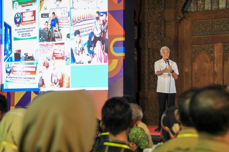 JawaPos.com - Gubernur Jawa Tengah (Jateng) Ganjar Pranowo meluncurkan aplikasi Sistem Administrasi Manunggal Satu Atap Badan Usaha Usaha Digital Mandiri (Samsat Budiman) di Semarang, Senin (19/6). Peluncuran aplikasi ini sebagai wujud komitmen mempermudah pembayaran pajak bagi wajib pajak di desa-desa.