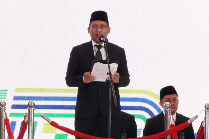 Direktur Utama PT Pegadaian Damar Latri Setiawan menyampaikan amanat pada upacara peringatan HUT ke-122 Pegadaian yang digelar secara hibrid secara serentak di seluruh Indonesia, Sabtu (1/4/2023)