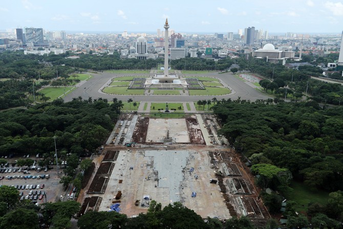Suasana pembangunan Plaza Selatan Monumen Nasional (Monas) di Jakarta, Kamis (23/1/2020). Ketua Komisi D DPRD DKI Jakarta Ida Mahmudah meminta revitalisasi kawasan Monas dihentikan sementara waktu hingga Pemprov DKI Jakarta mendapatkan izin dari Kementeri