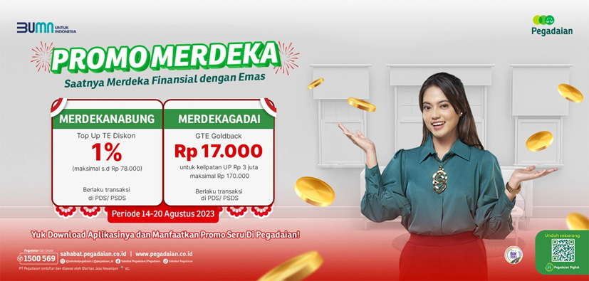 “Dengan adanya Program Promo Merdeka ini, diharapkan masyarakat Indonesia dapat mewujudkan kemerdekaan finansial dalam hal berinvestasi, serta memenuhi kebutuhan produktif maupun konsumtif dengan memanfaatkan emas sebagai barang jaminan, dengan kemudahan yang diberikan melalui program pendanaan Pegadaian” jelas Sekretaris Perusahaan PT Pegadaian Yudi Sadono.