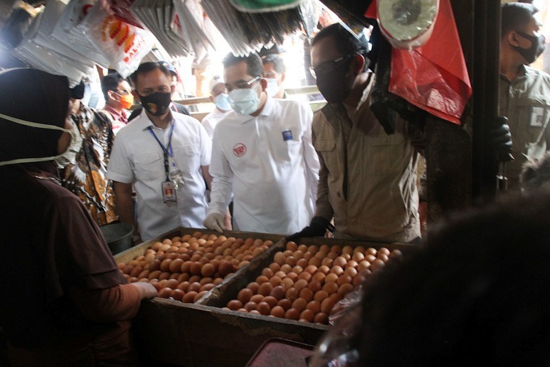 --MENDAG SIDAK KETERSEDIAAN BAHAN PANGAN-- Menteri Perdagangan Agus Suparmanto (tengah) bersama Wali Kota Bogor Bima Arya (kanan) berbincang dengan pedagang telur ayam saat sidak ketersediaan bahan pangan di Pasar Baru Bogor, Jawa Barat, Minggu (17/5/2020