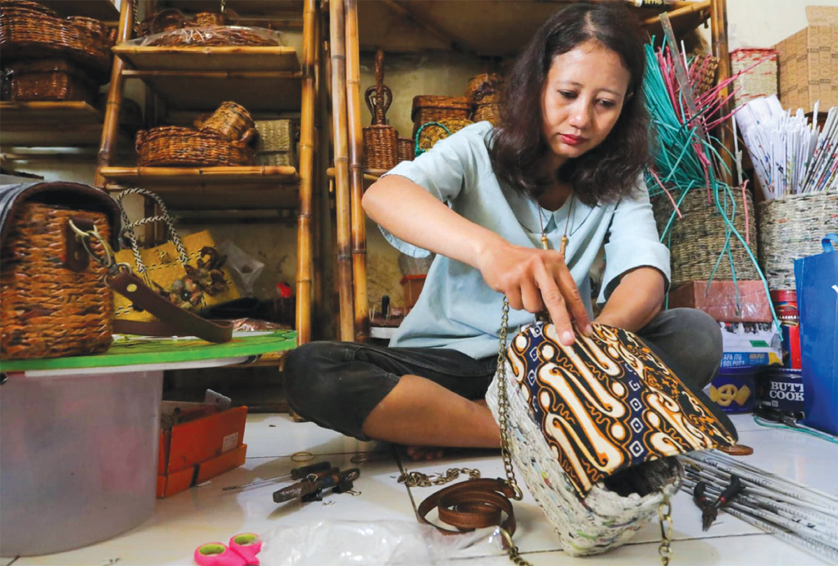 RAMAH LINGKUNGAN: Kristanti Nareswari, pemilik usaha Setyo Handmade dari Boyolali, menunjukkan produk daur ulang limbah kertasnya.