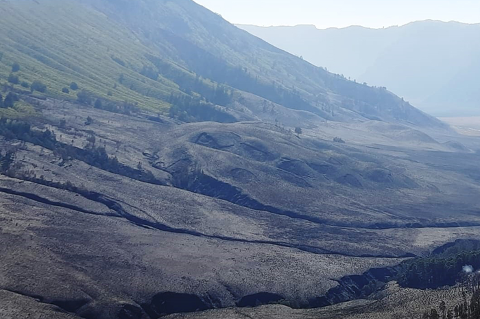 EFEK TERBAKAR: Kawasan Bukit Teletubbies di Gunung Bromo terlihat menghitam setelah terbakar.