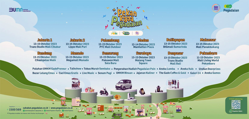 Jadi, yuk ikutan datang ke Pekan Raya Pegadaian. Khusus untuk wilayah jakarta, Pekan Raya Pegadaian akan digelar di Trans Studio Mall Cibubur dan Lippo Mall Puri pada 13-15 Oktober 2023, dan untuk penyelenggaraan Pekan Raya Pegadaian di 10 wilayah lainnya bisa di cek melalui link https://sahabat.pegadaian.co.id/acara.