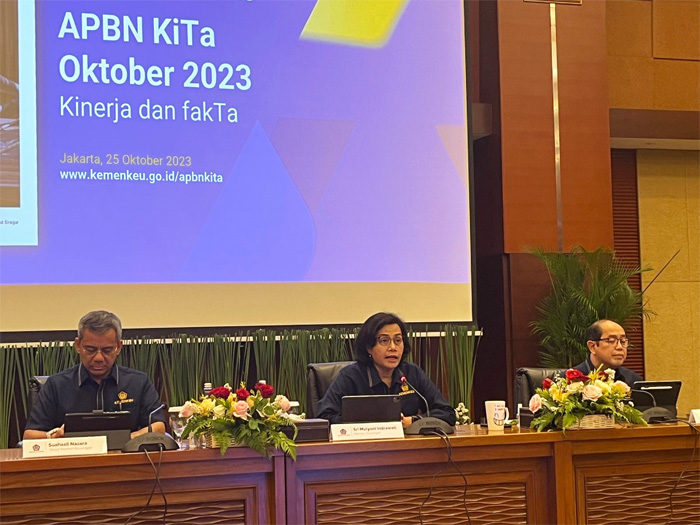 Menteri Keuangan Sri Mulyani Indrawati saat konferensi pers APBN KiTa, Rabu (25/10).